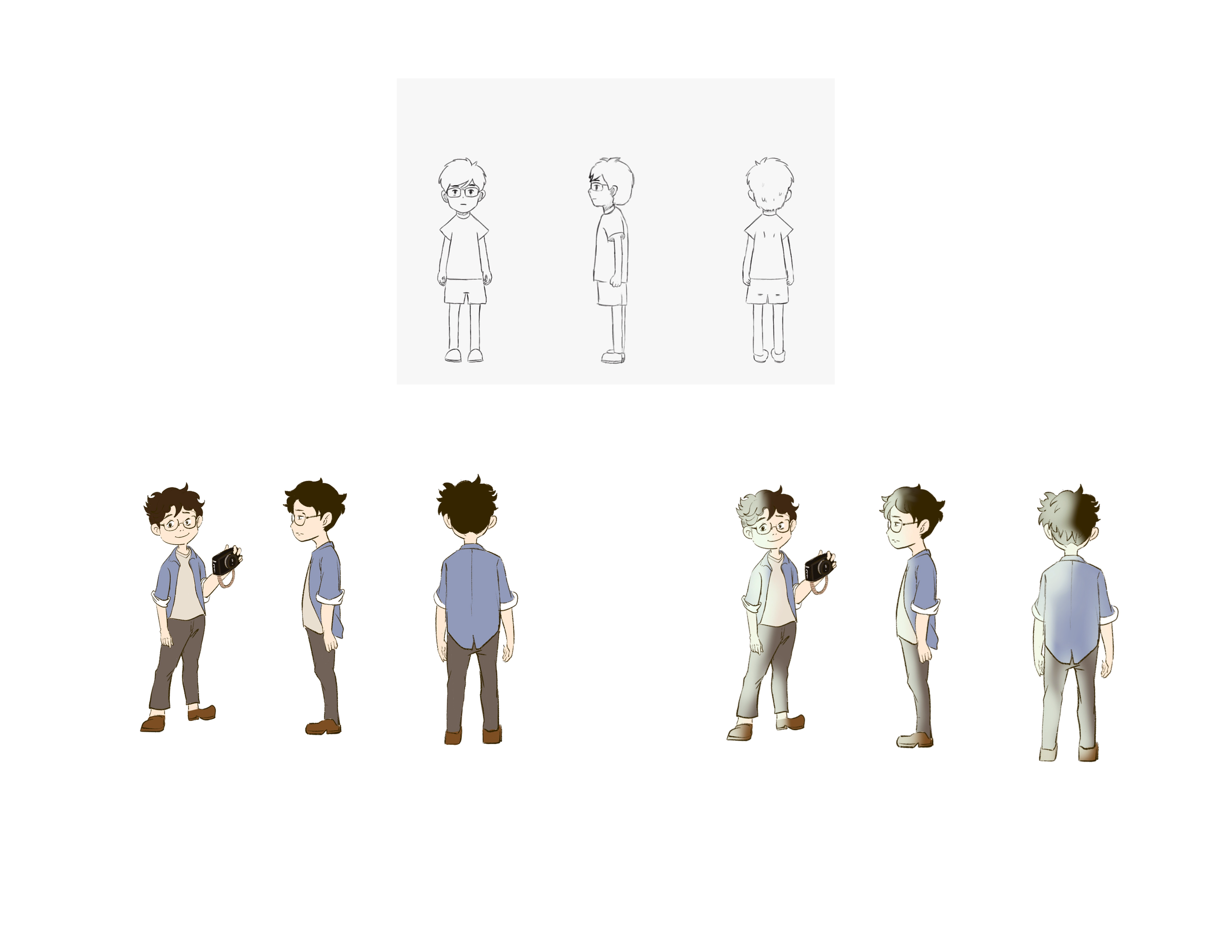 I first designed the character model using line-art sketches.